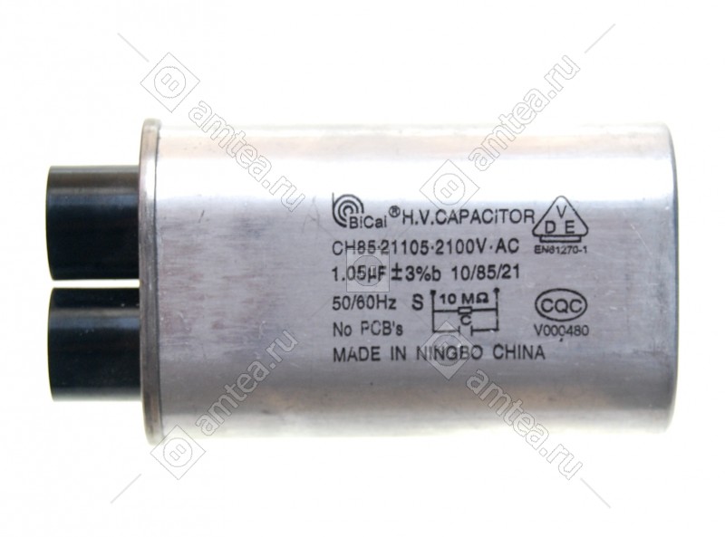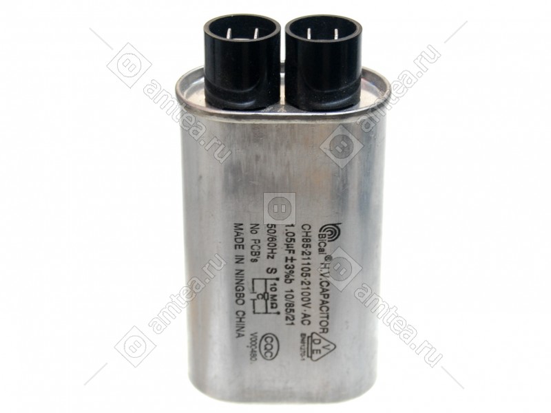 Конденсатор, расчитанный на номинальное напряжение 220 Вольт и емкостью 1,05 микрофарад. При замене важно соблюдать емкость и рабочее напряжение конденсаторов, в противном случае возможен преждевременный выход из строя как конденсатора так и других элементов в цепи. При замене соблюдайте осторожность! Конденсатор для СВЧ печи способен накапливать электрическую энергию и при замене возможно поражение электрическим током до 10 киловольт. Будьте осторожны и соблюдайте меры безопасности!
