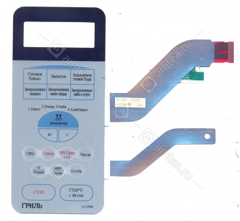 Сенсорная панель Samsung G2739NR самоклеящаяся. Для установки достаточно отклеить защитную пленку и приложить к декоративной панели микроволновой печи. Будьт очень аккуратны с сенсорной панелью. Не допускайте ее сильных перегибов, а также перегибов и механических повреждений токопроводящих шлейфов. Чрезмерный перегиб шлейфа может привести как к частичной так и к полной потере функций сенсорной панели Samsung G2739NR.Цвет серебристый. Функционально аналог DE34-00115F. Симтомы выхода из строя - перестают реагировать на нажатие некоторые кнопки либо все кнопки сразу. ДЛя замены подденьте край панели на СВЧ печи плоским острым предметом, например ножом и отклейте полностью панель от корпуса микроволновой печки. Далее вам нужно отсоеденить конец шлейфа от платы управления а также шину заземления. Для этого нужно снять крышку микроволновки, отсоединить шлейф управления мембраной от платы управления и , открутив винт от корпуса, отсоеденить шину заземления. Далее налеиваем новую сенсорную панель на СВЧ Samsung (Самсунг), предварительно вставив шлейф и шину в соответствующие прорези. Сборку осуществляем в обратной последовательности.